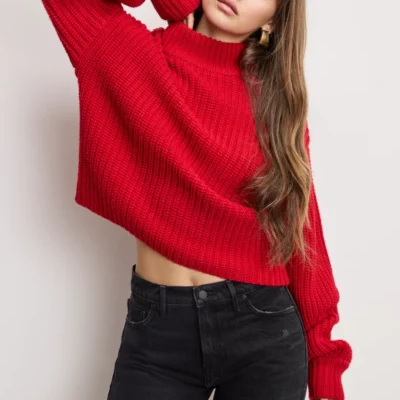 I found the perfect red sweater to wear with high-waisted jeans. I love a chunky sweater, and this mock-neck, cropped-but-not-too-cropped cut is perfect for cozy, chic winter outfits all season long. – Camille Styles, Editor-in-Chief